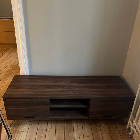 Tv møbel med låger. Cm 180b x 44,5d x 48h. Bemærk: der er fejlagtigt boret huller i bunden af hver låge til greb. Det ses dog ikke så tydeligt.