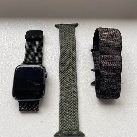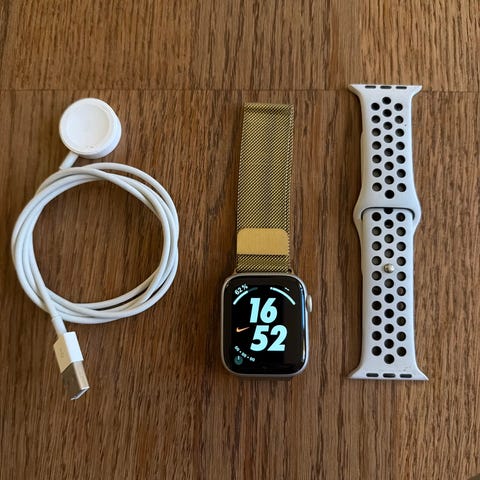 Apple Watch Series 5 smartwatch 44mm i sort med silikonerem. Uret har rektangulær skærm og digital krone i siden. Bagsiden viser pulssensor og opladningsflade. Medfølgende magnetisk opladerkabel med USB-A stik. Velegnet som smartur til hverdagsbrug med funktioner som notifikationer, aktivitetssporing og pulsmåling, når det er parret med en kompatibel iPhone.