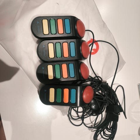 Sættet består af to kablede Buzz!-controllere med farvede knapper