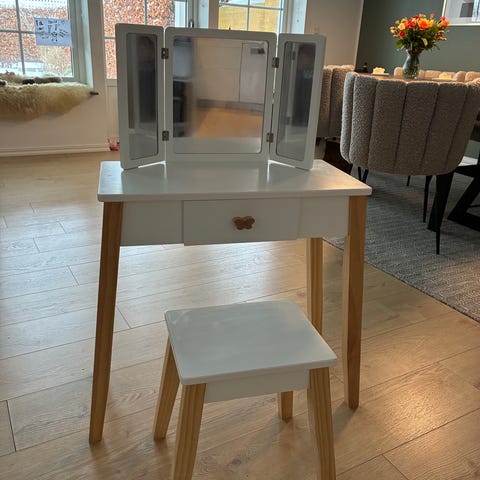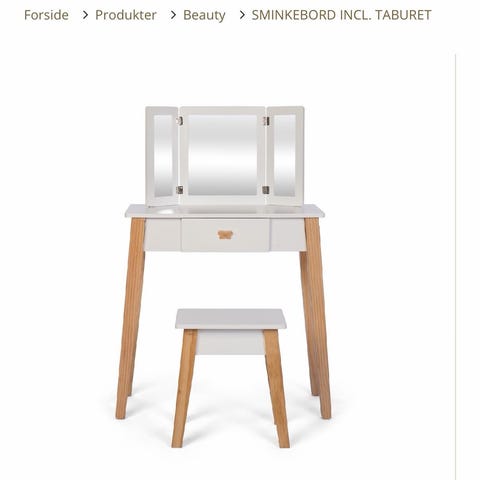 Designet i nordisk stil og med spejle så man kan sidde og gøre sig fin. Sminkebordet har skuffe til hårnips, pynt og tilbehør, og er fremstillet i MDF og bøgetræ, m. spejl i akryl, så det er mere sikkert for børn. Måler bord: 58 x 30 x 61 cm - Inkl. spejl H: 86 cm. Taburet 30 x 24 x 34 cm.