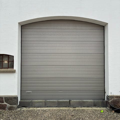 Vippeport med automatik 230x225cm. Produceret af GMS/Arkas. Porten er hvid udvendig og grå indvendig. Der medfølger skinner og en motor af mærket Starcur, hvor standen ikke er kendt. Der medfølger ikke nøgle til låsecylinderen. Det givne mål er ydre karmmål. Karmen måler bredde 6cm, hvilket betyder at selve vippe delen måler 218x219cm. Porten er lidt beskidt og har brugsspor. Dimension B:230 X H:225 X D:6cm