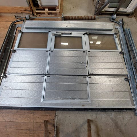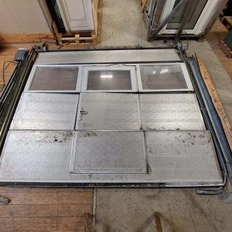 Ledhejseport med dør 300x245cm med hvad der vurderes til at være 120 grader port skinner. Porten er alu betrukket på begge sider. Der medfølger loft og væg skinner, port-fjeder, rullere, samt en ældre NASSAU motor. Porten er produceret i år 2013 af NASSAU. De givne mål er maksimal hulmål, hvor porten kan dække hullet + 2 cm på hver side. Døren åbner højre ud og har dørpumpe, låsecylinder og vrider. Der medfølger ikke nøgle til døren. Motorens stand kendes ikke. Har en sprækket rude, men ellers i OK stand med brugsspor. Dimension B:300 X H:245 X D:5cm