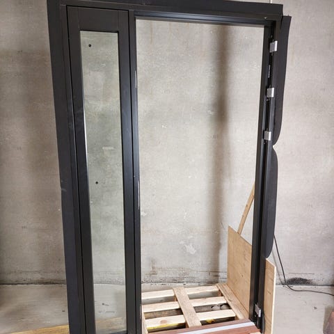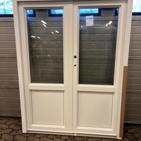 Terrassedør 105,8x234,8cm i træ med 2-lags lamineret/sikkerheds energirude, hårdttræsbundstykke og 3-punktslås. Produceret af Outline. Åbner venstre ud. Har en grim fuge på indvendig side, en dårligt monteret tætningsliste som syntes at drille lidt med grebet og lidt skrammer, men har aldrig været monteret. Dimension B:105,8 X H:234,8 X 11,5cm