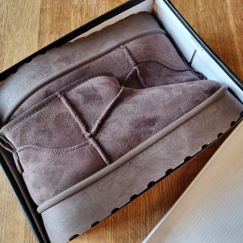 Bamsestøvler i størrelse 39/40. Støvlerne er i en brun farve med blød, lys foring indvendigt. Mellemhøjt skaft og flad sål med bølget mønster under bunden. Velegnet som varme og komfortable hverdagssko i køligere vejr.