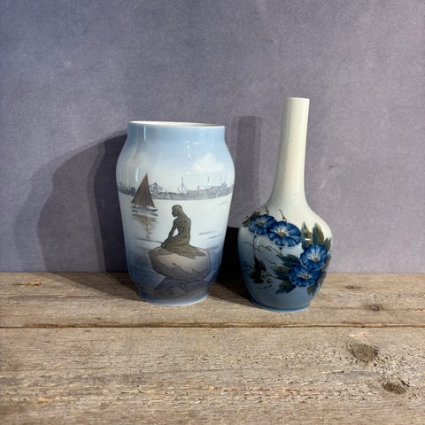 Vase i porcelæn og cylindrisk med afrundet top og dekoreret med den lille havfrue. Undersiden er mærket stempel. Velegnet som dekorativ brugsvare eller til blomsterarrangementer i hjemmet.