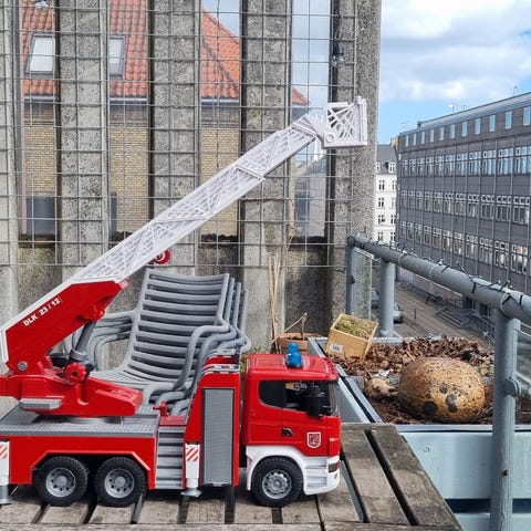 Bruder MAN brandbil legetøjsbil med fjernbetjening i rød plast. Modellen forestiller en brandbil med drejestige og støtteben. Køretøjet styres via medfølgende kabel-fjernbetjening. Egnet som legetøj til børn, til leg indendørs på gulv eller tæppe. Detaljeret udførelse med markeringer og lysdetaljer støbt i plast. Brug kræver batterier i både bil og fjernbetjening efter producentens anvisninger.😄
