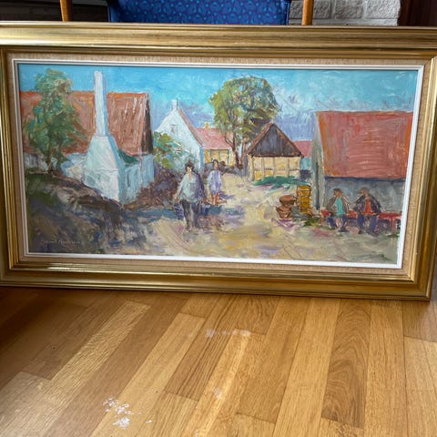 Maleri med landskabsmotiv i rektangulær træramme. Motivet viser en sø omgivet af træer og skov i dæmpede naturfarver med himmel i varme toner. Billedet er signeret i nederste hjørne. Maleriet er egnet til ophæng i stue, entré eller andre opholdsrum og giver et klassisk, naturinspireret udtryk til indretningen.