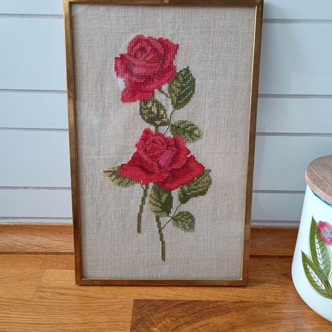 Messing ramme med broderi høj 27 cm -bredde 18 cm, broderi af 2 roser på gren. messing ramme intakt lige til at hænge op.