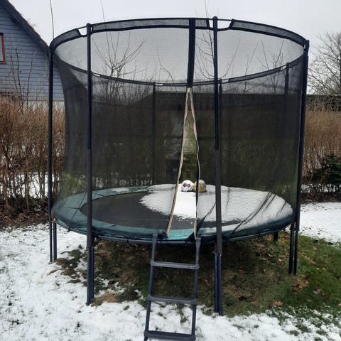 Den er købt i sommers og vi sælger den fordi vi flytter og det nye hus har allerede en trampolin.