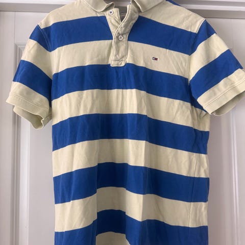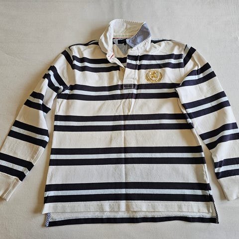 Tommy Hilfiger langærmet polo til herre i størrelse L. Trøjen er fremstillet i bomuld og har brede, vandrette striber i blå og hvid. Den har klassisk polokrave i kontrastfarve, knaplukning ved halsen og broderet logo-/emblem-detalje på brystet. Egnet som hverdags- eller fritidstrøje.