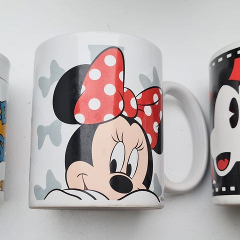 Ældre Mickey Mouse plastikkrus med mærkning “Staffordshire Kiln Craft England” i bunden.
