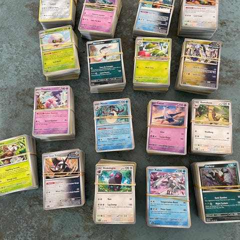 Barnet i husstanden samler ikke længere på pokemonkort. Der er over 100 kort i hver bunke. Der er en bunke med ca. 150 energikort og ellers er alle de andre bunker kun Pokemoner og trænerkort.