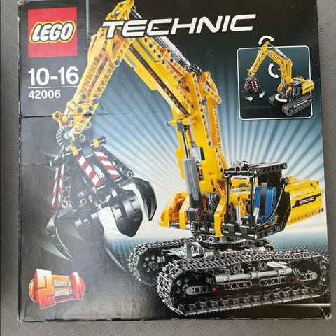 Lego Technic byggesæt af gravemaskine med larvefødder. Sættet indeholder gule, sorte og blå teknikelementer samt diverse små dele og klodser i poser. Der medfølger byggevejledning og klistermærker til modellen. Velegnet til byggeri og leg med tekniske Lego-konstruktioner.