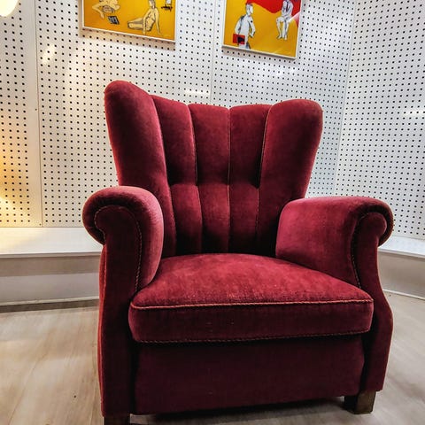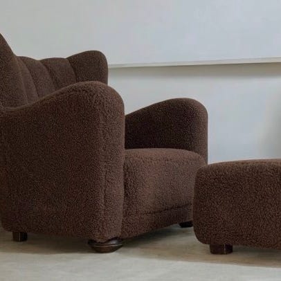 Overpolstret lænestol fra 1940’erne med skammel.