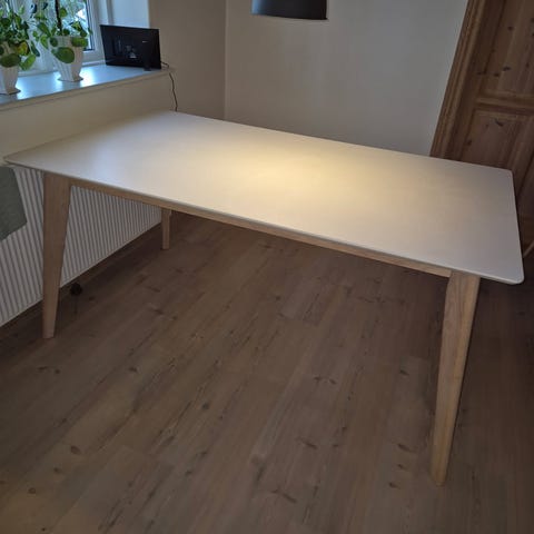 Jeg sælger dette flotte spisebord, med målene: højde: 75cm, bredde: cm. 99,5cm, længde: ca. 236cm. Bordet kan forlænges med plader af 2x50 cm. Bordet er brugt men fungere super godt. Der er et par mærker i bordet, som kan ses på billederne, men intet man ligger mærke til. Der er en lille kuglepind streg, men ikke specielt tydelig.