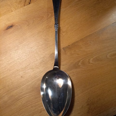 Skaftet har en dekorativ afslutning med ornamentik i toppen. Egnet til servering af fx kartofler, grøntsager eller andre retter ved borddækning. Materiale og præcist mønster fremgår ikke nærmere af oplysningerne, men skeen fremstår som klassisk bestik til køkken og spisestue. Længde 36 cm.