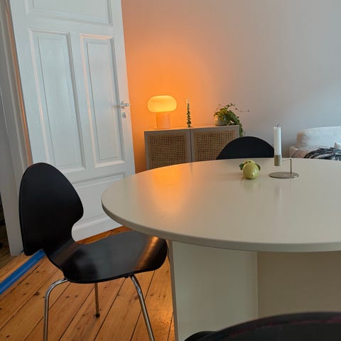 Rundt spisebord malet i chamerende ferskenfarvet orange.