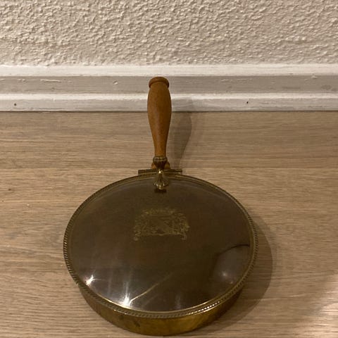 Silent Butler / lågpande (askebæger) i messing med håndtag af træ.
