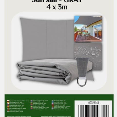 Sun sail solsejl i størrelsen 4 x 3 meter i beige. Rektangulært solsejl velegnet til terrasse, have eller gårdhave som skyggegivende overdækning. Leveres med fastgørelsesøjer i hjørnerne til montering med reb eller beslag efter behov. Materiale og øvrige specifikationer fremgår af original emballage.