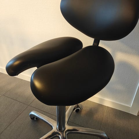 Sadelstol, lav model, til f.eks fodklinik , Højdeindstilling 45cm til 60cm. Gasfjeder, fjedrende sæde. Man sidder godt på stolen.