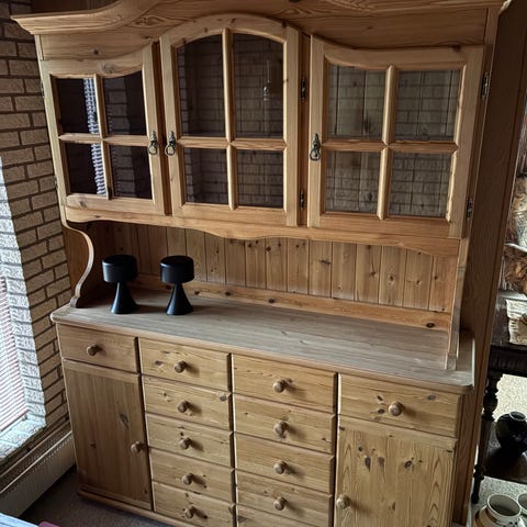 Massiv træskænk og vitrineskab i rustik stil med smukke detaljer og mørk varm træfarve 🪵