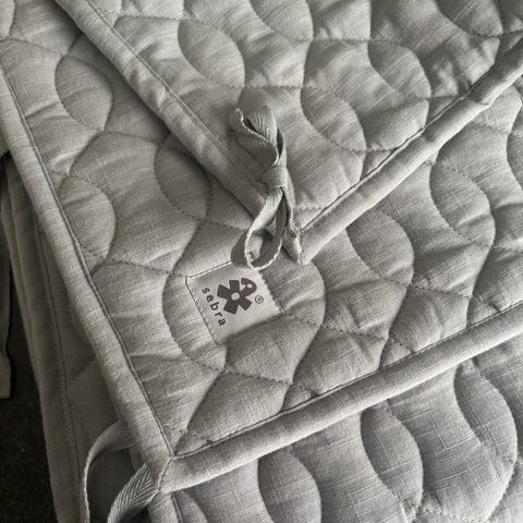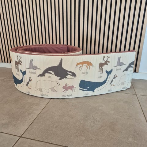 Sebra sengerand med dyremotiv. Sengehesten har tryk af forskellige dyr i afdæmpede farver på ydersiden og ensfarvet stof på indersiden. Den er polstret og kan rulles sammen for opbevaring. Velegnet til brug i tremmeseng eller juniorseng som blød kantbeskyttelse for barnet.
