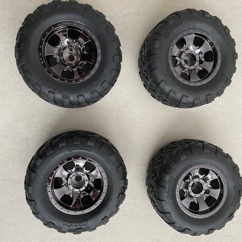 Crawler hjul. Helt nye / ubrugte og komplette, Nitto Trail Grappler M/T 1.9x4.7"// Hex 12mm. Ca 120mm i diameter og ca. 40mm i bredden. Blødt gummi og groft dækmønster. De står fint i str. til 1/10 og 1/8 Short Course trucks samt som Monster Truck hjul til de mindre 1/10 pickup trucks. Plus fragt ved forsendelse. Kan afhentes i 6300 Gråsten