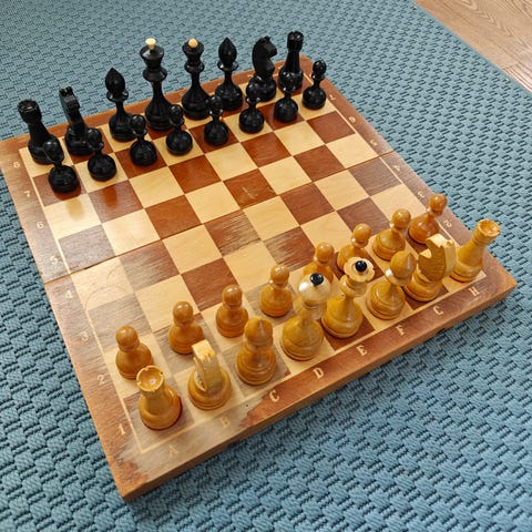 Skakspil med sammenfoldelig pap plade og indlagt regler for skakspil.