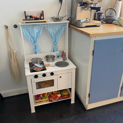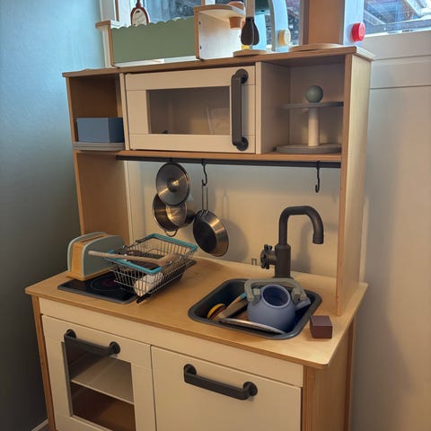 IKEA DUKTIG legekøkken ombygget til den fineste lille café/butik. Stilfuldt renoveret med lækre detaljer. Malet med slidstærk Dyrup maling i superflot babylyserød farve og monteret med flotte folier. Der er sat helt ny, ekstra stor bordplade med elegant fræset kant på (mål 86x40 cm). Med pæne stålgreb på lågerne. Der er elektrisk lysliste med multifarvet lys henover bordpladen. Fine nyindkøbte kager til at lege med. Der medfølger også et fint etagefad til kager, lyserøde tallerkner og et lille butikskilt og ydermere har jeg også købt lidt helt nye træsmåkager, slik og et fint kasseapparat. Der er også en ny "varekasse" til de fine grøntsager. Alt man ser på billederne følger med. Der er lys i "ovnen" (med fjernbetjening).