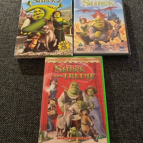 Shrek Trilogien dvd samling. Indeholder filmene Shrek, Shrek 2 og Shrek Den Tredje samlet i én udgivelse. Dansk aldersmærkning A på forsiden. Velegnet til afspilning på dvd-afspillere, der understøtter det regionale format angivet på omslaget.