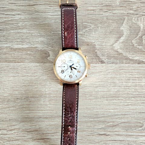 Brugt jævnligt. Uret fungerer som det skal, men har desværre ridser på urkasse/rem efter almindelig brug – se billeder.