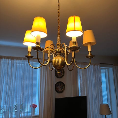 Loftlampe i lysekrone-design med 12 kugleformede glasskærme monteret på arme i messingfarvet metal. Lampen er beregnet til montering i loft og giver lys i flere retninger via de mange lyskilder. Velegnet til større rum som stue, spisestue eller butikslokale, hvor der ønskes jævn belysning fra en central loftlampe. Tre stk sælges pr stk 350,- samlet for alle tre 950,-