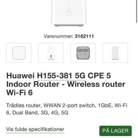 Huawei 5G router i hvid. Enheden har flere ethernetporte på bagsiden til kablet netværksforbindelse samt strømtilslutning i bunden. Routeren er beregnet til 5G-mobilnetværk og kan bruges som internetløsning i hjemmet eller på kontoret, hvor der er dækning fra en 5G-udbyder.