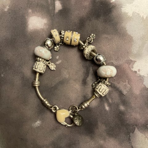 Et ud af to ægte Pandora armbånd med mange charms sælges.