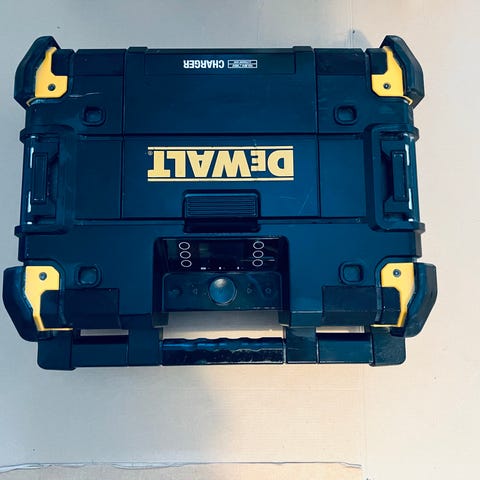 DeWalt Toughsystem DAB+ radio med oplader i sort/gul plastkasse. Enheden fungerer som byggepladsradio og har indbygget oplader til DeWalt batterier. Radioen er integreret i en robust Toughsystem-kuffert med bærehåndtag og forstærkede hjørner. Velegnet til brug på byggeplads eller i værksted, hvor der er behov for både musik og opladning af kompatible DeWalt batterier.