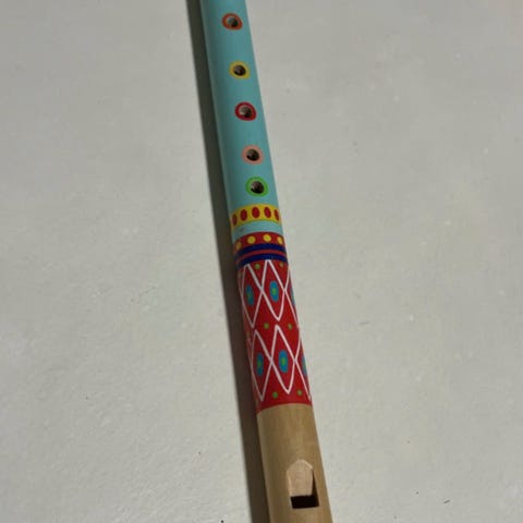 Træfløjte i malet træ med blå overflade og røde, gule og hvide mønstre. Fløjten har flere fingerhuller på forsiden og en udskåret munddel i naturfarvet træ. Egnet som enkel musikinstrument til børn eller begyndere og kan bruges til leg, rytmik og musikøvelser.