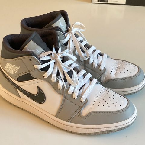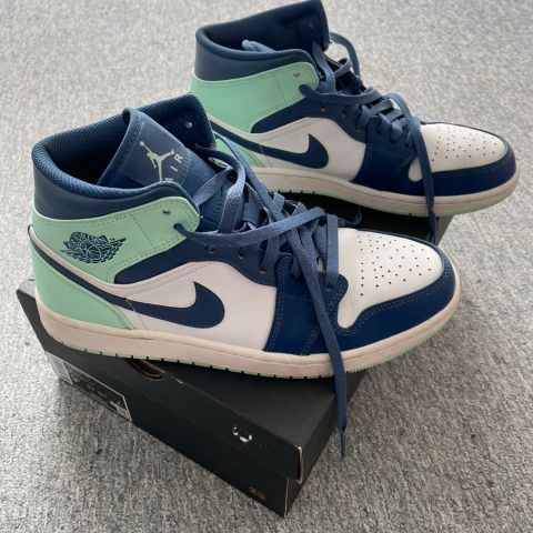Nike Air Jordan 1 Mid sneakers i størrelse 45. Højskaftet model i blå og sort farvekombination med hvid mellemsål. Klassisk snørelukning og gummisål. Egnet som hverdagssko og fritidssko.