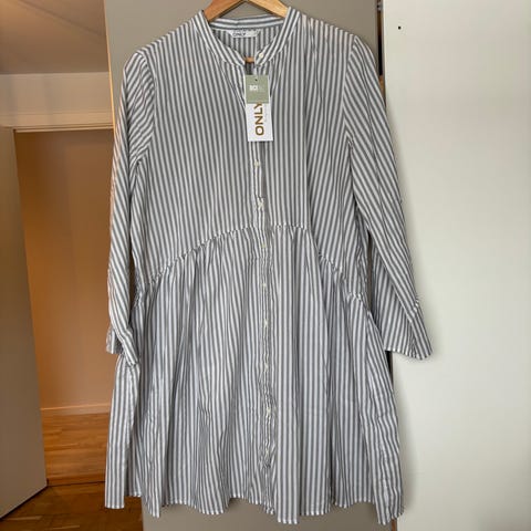 ONLY sommerkjole kjole i str. 40. Kjolen er blå med hvide striber og har lange ærmer. Den er fremstillet i bomuld og har gennemgående knaplukning foran samt rund halsudskæring uden krave.
