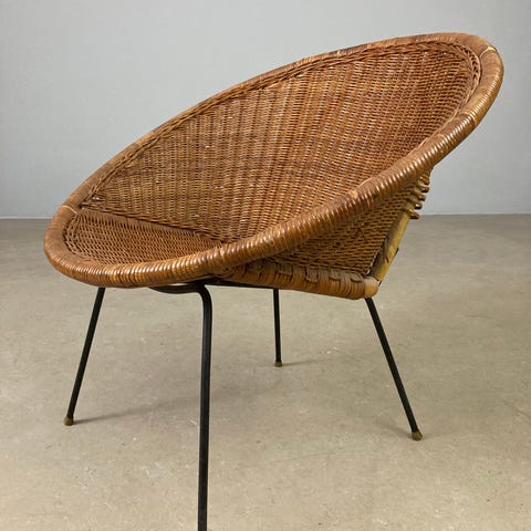 Bobbin Chair vintage hjørnestol i massivt egetræ med sæde af naturbåndflet, 1940–1950, i god vintage stand. Klik på den blå "gå til varen" knap, for at købe eller byde på denne vare. Den samlede pris vil blive vist inden du afgiver dit bud.