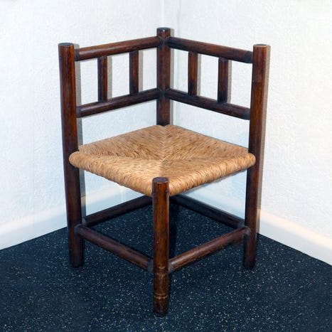 Bobbin chair. Vintage hjørnestol af egetræ med fletet sæde. Boho Ibiza chic.