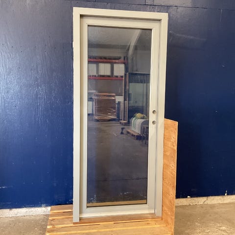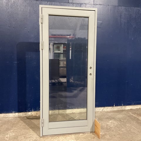 Brugt Idealcombi Yderdør, Alu/træ, 2 lag glas, hårdttræsbundstykke, højrehængt, indadgående, mål: H214 B94,5 D12,3 Varenummer: 1723