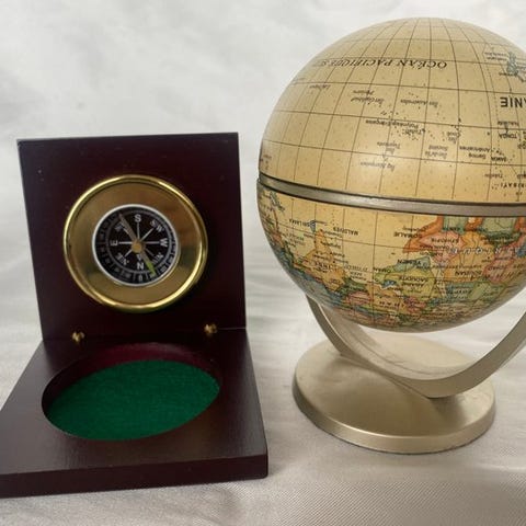 Antikt nautisk træbibelstativ med bronzekompas og globus, oprindelse Japan, fra 1970'erne, i fremragende stand og fuldt funktionsdygtig, mål cirka 14 cm højt, 14 cm bredt, 9 cm dybt. Klik på den blå "gå til varen" knap, for at købe eller byde på denne vare. Den samlede pris vil blive vist inden du afgiver dit bud.