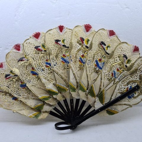 Tre håndmalede vintage/antikke fans, lavet af silke/uld? og/eller blondine på en træ- eller plastlignende base, fra Spanien/Frankrig, cirka 45 cm åbnet og 25 cm høj, i god brugt stand med små tegn på aldring og pletter, dateret 1900–1970. Klik på den blå "gå til varen" knap, for at købe eller byde på denne vare. Den samlede pris vil blive vist inden du afgiver dit bud.