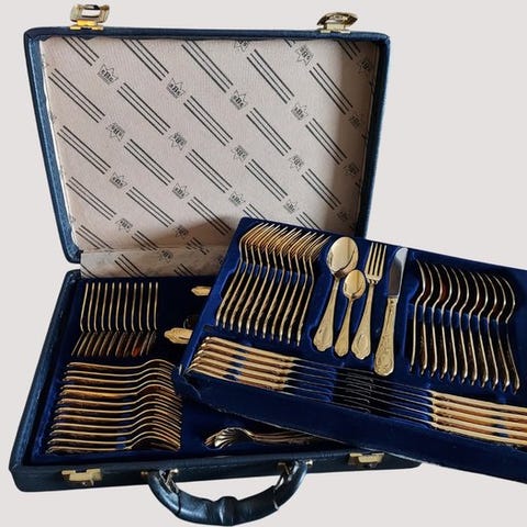 Der mangler blot 6 små skeer, 7 kagegafler, 1 dessertgafle, 1 kagegaffel (se billeder).