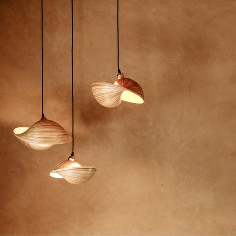 Hvert lampehat er håndlavet af lag af tyndt skåret bambus, hvilket skaber den ikoniske ‘Shell’-form. Da disse lamper er lavet af et naturligt materiale, kan de variere lidt i farven. Det kræver en håndfuld mænd at forme lampehatten i denne form.