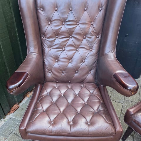 Sælger den smukke skipper bamsestol ompolstrede hos prof polstre i originalt rød hallindal kvadrat stof , negle og ben i egetræ, står virkelig flot med alt nyt indmad☺️