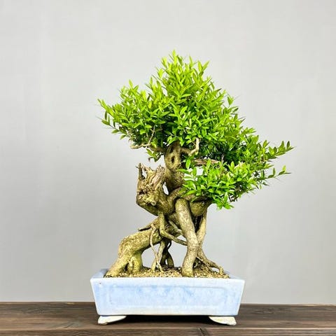 Buxus Harlandii med smuk gammel stamme. Bonsai står allerede i en fin og kvalitetsmæssigt god bonsaiskål.