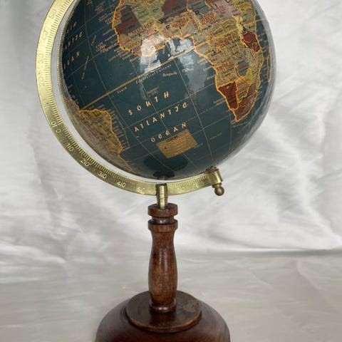 Vintage par af bogstøtter formet som et luksuriøst globus på drejet træ, med metaldele. Tilstanden er god trods årene, næsten som ny. Fotosene viser skygger, men alt er i orden. Vedlagt er et omfattende fotodokumentation til vurdering og overvejelse af den viste tilstand. Der vil blive brugt særlig indpakning til destinationen. Forsendelser uden for Den Europæiske Union eller uden for Europa og uafhængige områder er ikke inkluderet i forsendelsesprisen hos Catawiki og medfører en ekstra forsendelsesomkostning.