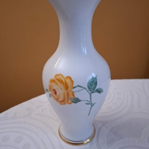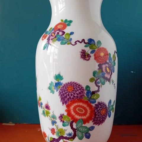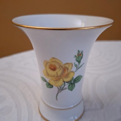 Meissen porcelænsvas fra Tyskland, dateret 1940–1950, i fremragende stand med blå Meissen sværdmærke udført på bunden. Klik på den blå "gå til varen" knap, for at købe eller byde på denne vare. Den samlede pris vil blive vist inden du afgiver dit bud.