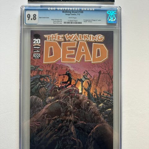 The Walking Dead første udgave graderet som CGC 9.8, nummer 144, med Charlie Adlard, Stefano Gaudiano og Robert Kirkman, udgivet af Image Comics, hæftet binding, i mint tilstand. Klik på den blå "gå til varen" knap, for at købe eller byde på denne vare. Den samlede pris vil blive vist inden du afgiver dit bud.